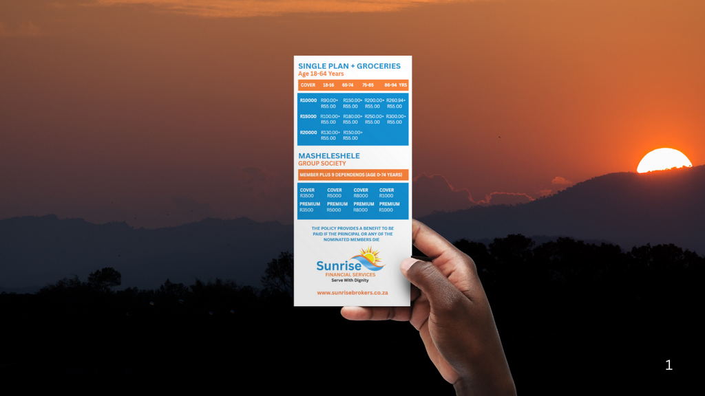 Sunrise Financial Services (Pty) Ltd is a black woman owned company that aim to assist disadvantage communities with basic funeral cover that is dignified funeral service at a low and affordable price.